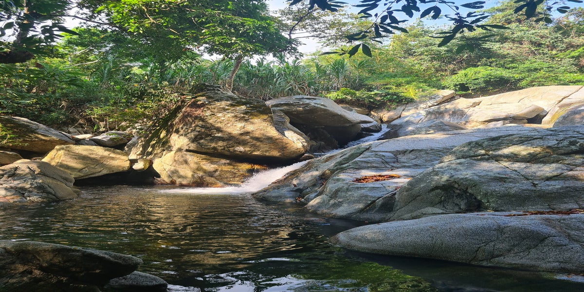 Daarna ben ik weer gaan overnachten in de perm cukture farm van Pablo en Coleen en hun dochtertje Amber op de Orinoco bergflank, die eerder die week de minga voor het schooltje organiseerden. Die nact regende het voor het eerst sinds lange tijd. De volgende ochtend vertrokken Soleia en ik met Coleen en haar zussen voor een lange tocht door de Mendihuaca rivier waarin we over rotsblokken klauterden, die soms spekglad van de regen waren. Onderweg kwamen we steeds weer een grote, blauwe koningsvlinder tegen. De tocht was intensief, maar zo leuk. De lach kon niet van mijn gezicht verdwijnen, ondanks de inspanning. Ik voelde me bevoorrecht en intens gelukkig. De eindbestemming was een prachtige metershoge waterval, waar we het water indoken en waar een kunstenaar stenen torentjes stapelde op plekken waar de rivier laag stond. Na afloop nam ik afscheid van mijn dierbare vriendin en water sister Soleia en vertrok ik naar Santa Marta voor de terugvlucht naar Nederland.